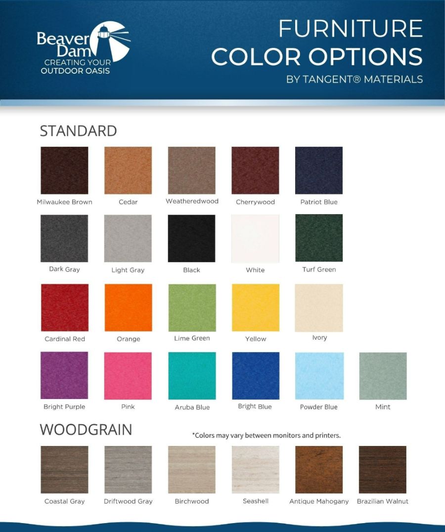 Beaver Dam Furniture manufactures casual outdoor furniture from recycled plastic lumber (RPL) because it’s a durable, environmentally-friendly alternative to traditional lumber. The material we use is made from an extremely high performance polymer that doesn’t require sealing, painting or staining. It will not rot or splinter, and contains UV inhibitors that resist fading. It contains no filler, such as wood fiber, that would cause moisture absorption and promote bacterial growth. The recycled material used in our plastic lumber is a combination of consumer waste and industrial by-products which would normally be disposed of in landfills.