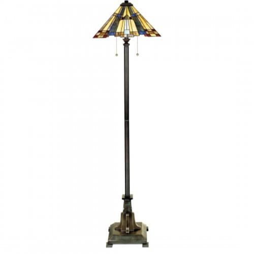This Arts and Crafts style features a pyramid shade with a stepped border for added visual interest. The classic geometric design includes art glass in shades of amber cream and tan accented with glass pieces in sapphire blue and rich green. The linear geometric details on the base makes it a perfect complement to the shade.