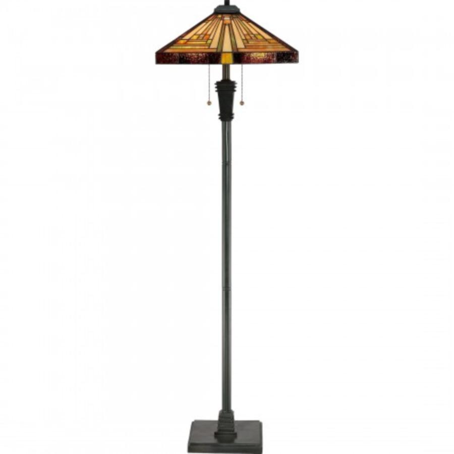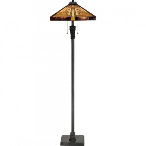 This handcrafted Tiffany style collection illuminates your home with warm shades of amber bisque and earthy green arranged in a clean and simple geometric pattern reminiscent of the works of Frank Lloyd Wright. The sturdy base complements the Arts & Crafts style and is finished in a Vintage Bronze.